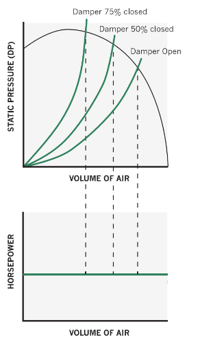 Figure A illustrates the typical relationship between a constant-speed fan and energy usage when using an outlet damper to mechanically control the system’s static pressure. The more a damper is closed, the higher the static pressure.