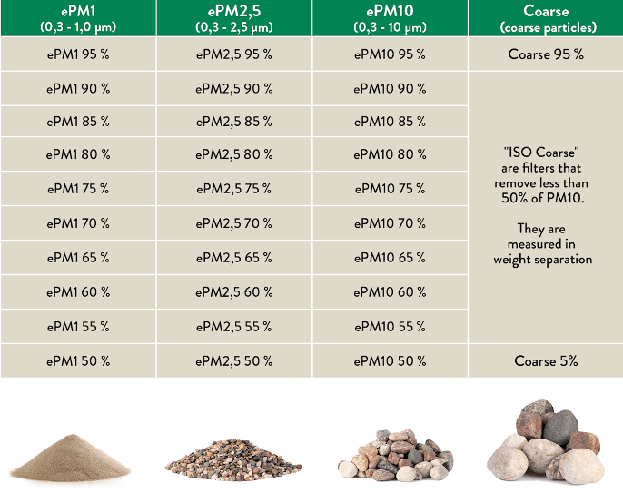 While the ePM (from ISO 16890) and MERV (from ASHRAE 52.2) ratings come from distinct testing approaches, they both utilize a 12-channel analyzer to measure the concentration of particles within the same size ranges, from 0.3 to 10 micrometers. Both methods compare the concentration of particles before and after passing through the filter. The chart below offers a rough comparison between these two methods of evaluating filter efficiency.